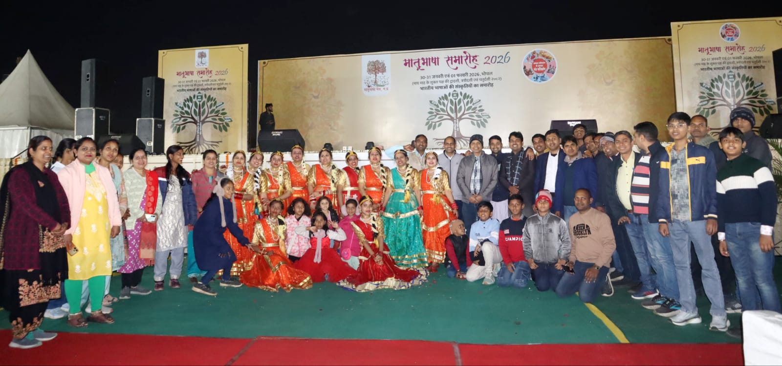 भोपाल। अंतर्राष्ट्रीय मातृभाषा समारोह–2026 के अंतर्गत मातृभाषा मंच भोपाल द्वारा दशहरा मैदान में आयोजित तीन दिवसीय वृहद एवं भव्य आयोजन में उत्तर प्रदेश सांस्कृतिक परिषद, बीएचईएल भोपाल ने भोजपुरी भाषाई समाज की मातृशक्तियों एवं बालिकाओं की सहभागिता से अपनी समृद्ध सांस्कृतिक धरोहर को प्रभावशाली रूप में प्रस्तुत किया। परिषद की ओर से पूर्वी, भोजपुरी एवं बुंदेली बोलियों पर आधारित कजरी, झूमर और मेघ मल्हार लोकगीतों पर केंद्रित समेकित लोकनृत्य प्रस्तुति ने दर्शकों को मंत्रमुग्ध कर दिया।